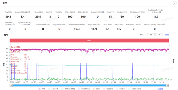为了进一步验证天玑8400-Ultra的游戏性能,我们进行了《原神》手游的测试。在最高画质和最高帧率下,特效全开进行了一局15分钟的须弥城跑图测试。结果显示,游戏平均帧率达到了59.3FPS,虽然期间略有波动,但整体流畅度在主打性能的手机中属于第一梯队,完全不用担心卡顿等问题。